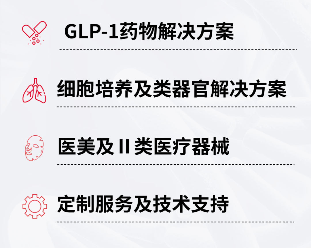 冀百康生物作為生物醫(yī)藥領(lǐng)域上游原料自研企業(yè),專注于:GLP-1類似藥物應(yīng)用領(lǐng)域、類器官應(yīng)用領(lǐng)域、醫(yī)美及Ⅱ類醫(yī)療器械應(yīng)用領(lǐng)域,可為下游企業(yè)提供了更高效、更安全、更優(yōu)質(zhì)的解決方案和定制化服務(wù)。